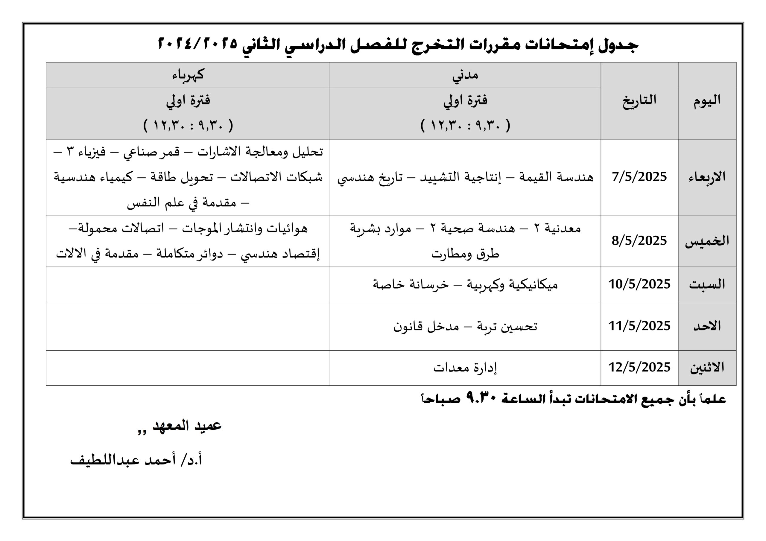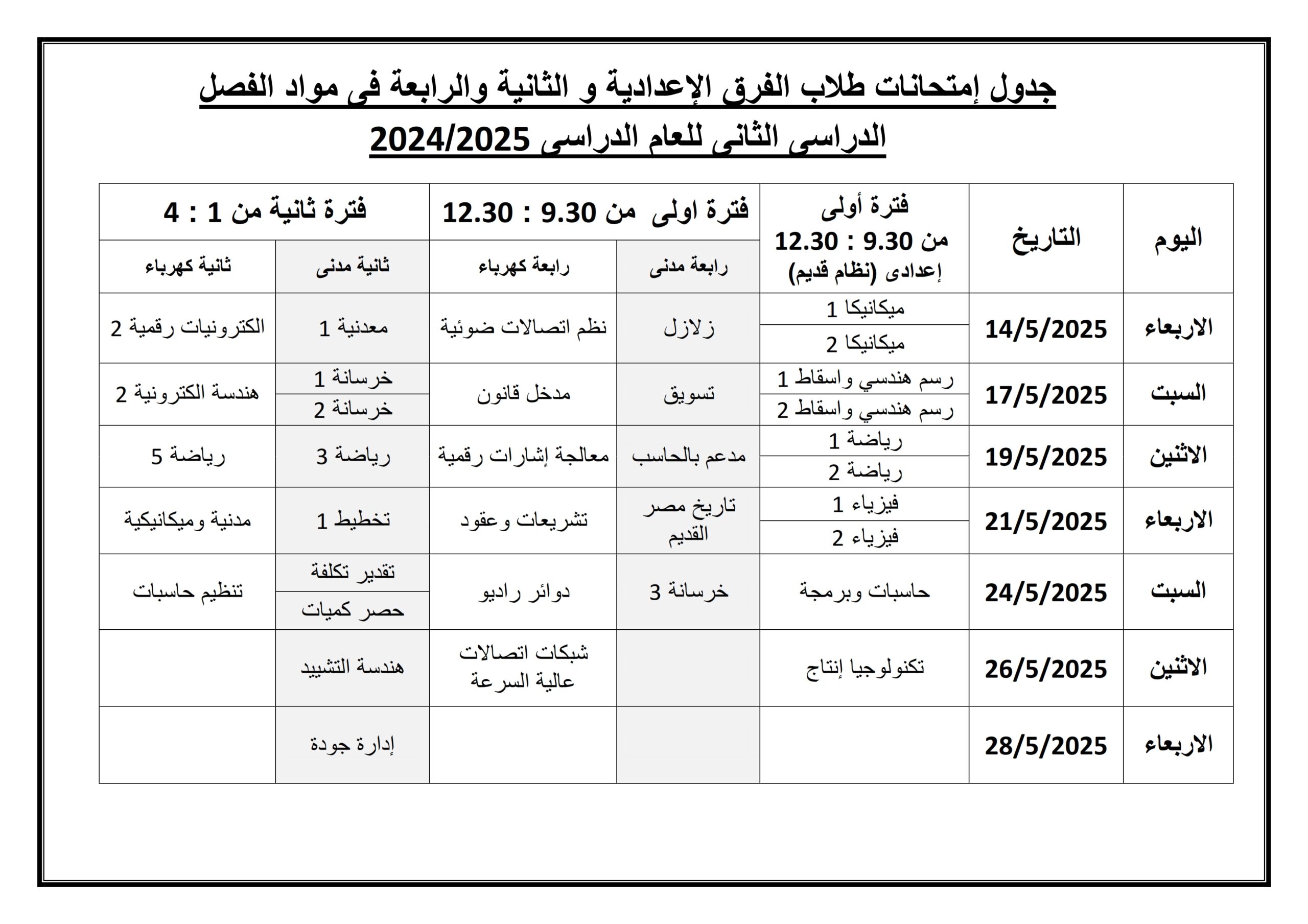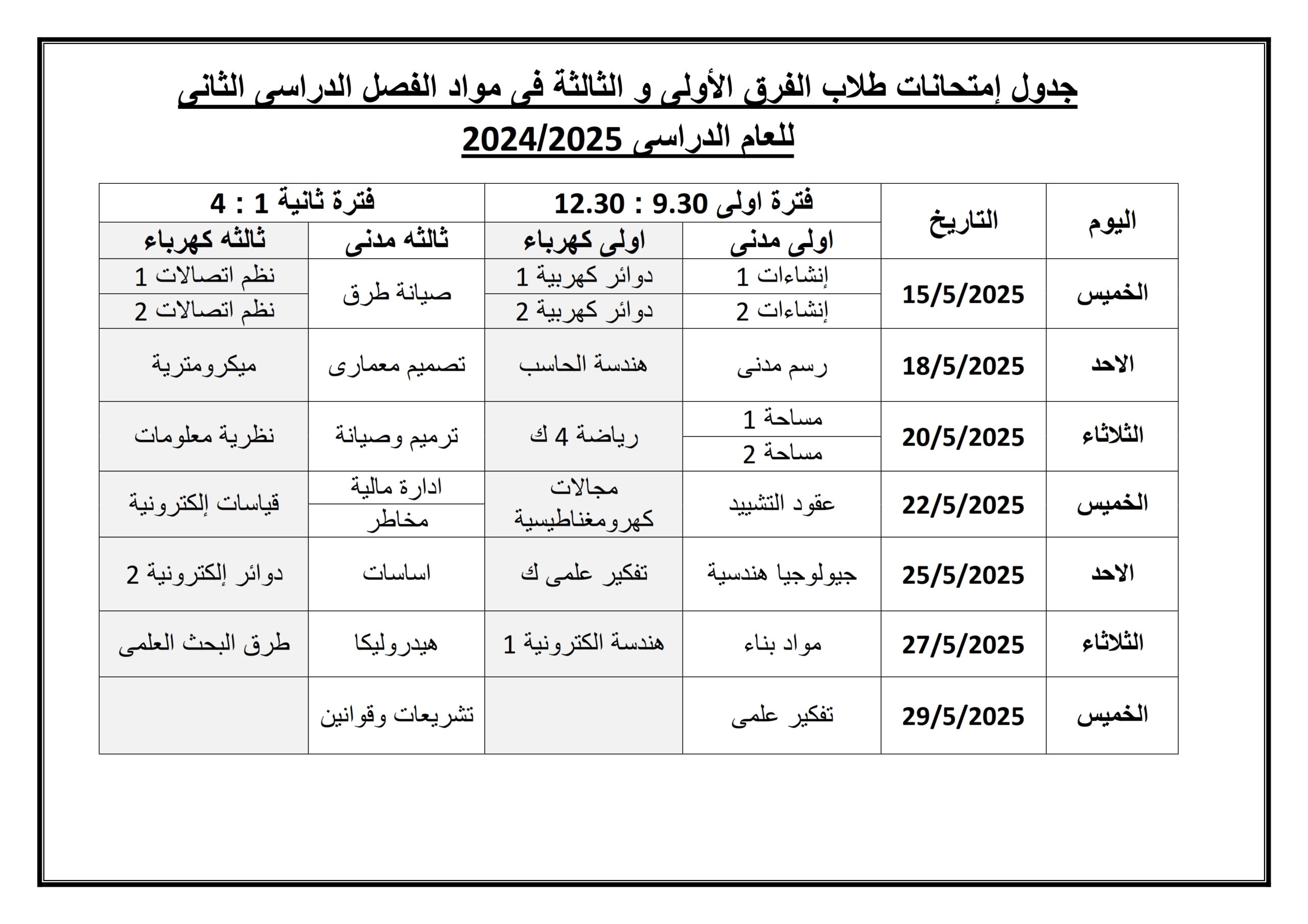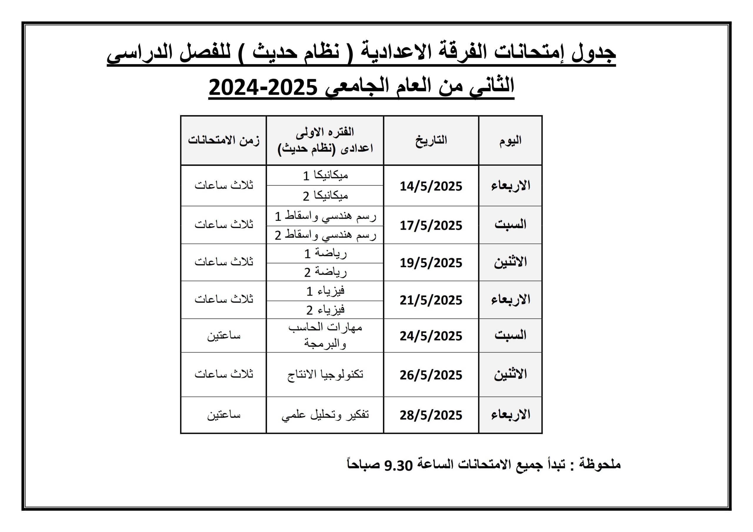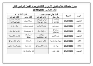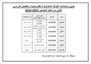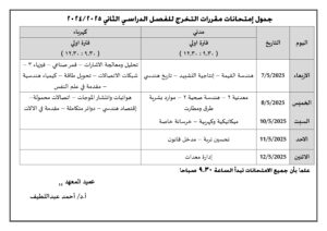 جداول امتحانات الفصل الدراسي الثاني لجميع الفرق وجدول مقررات التخرج للعام الدراسي 2024-2025 2025-04-15 اسماء موسي